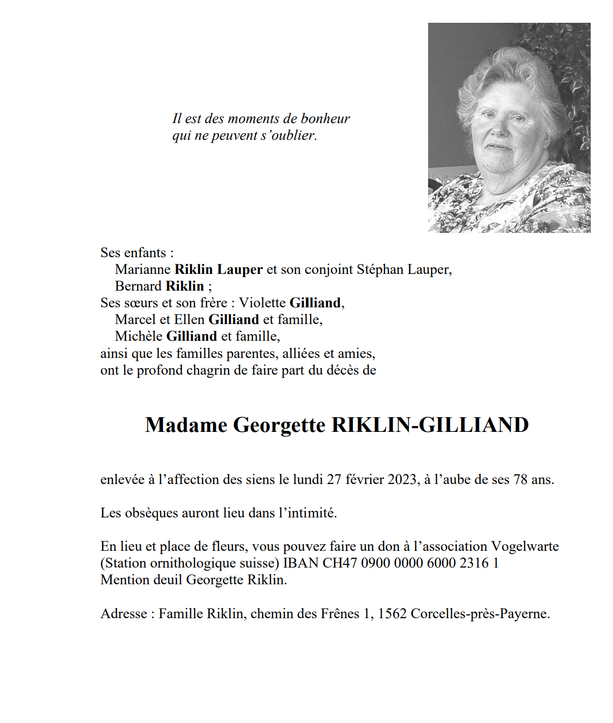 Madame Georgette RIKLIN-GILLIAND 16 mar. 1945 - 27 fév. 2023 Avis mortuaire PFG Télecharger PDF Partager sur: Galerie