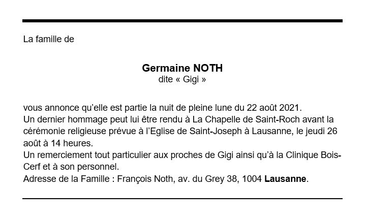 Madame Germaine NOTH 18 aoû. 1947 - 22 aoû. 2021 Avis mortuaire PFG Télecharger PDF Partager sur: Galerie PreviousNext PreviousNext