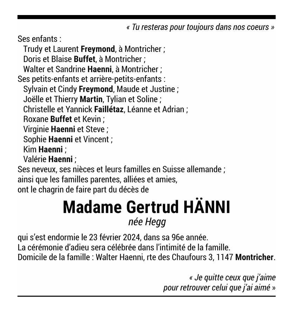 Madame Gertrud HÄNNI née Hegg 30 juil. 1928 - 23 fév. 2024 Avis mortuaire PFG Télecharger PDF Partager sur: Galerie PreviousNext PreviousNext