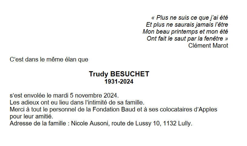 Madame Gertrude BESUCHET 22 jan. 1931 - 05 nov. 2024 Avis mortuaire PFG Télecharger PDF Partager sur: Galerie