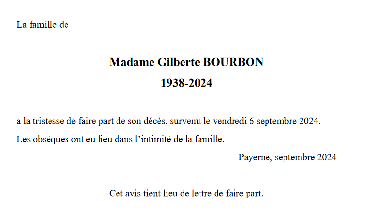 Madame Gilberte BOURBON 21 juin. 1938 - 06 sep. 2024 Avis mortuaire PFG Télecharger PDF Partager sur: Galerie