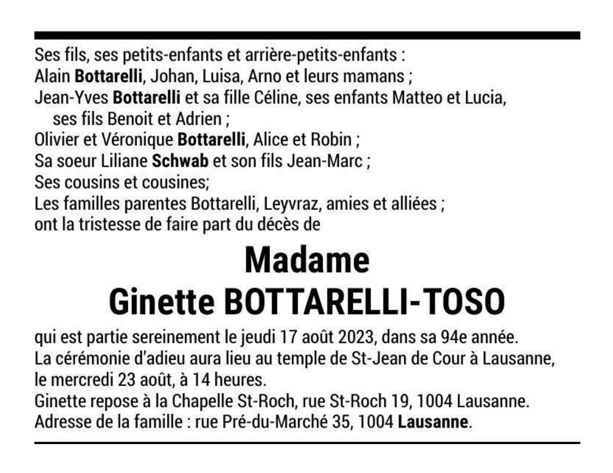 Madame Ginette BOTTARELLI-TOSO 05 sep. 1929 - 17 aoû. 2023 Avis mortuaire PFG Télecharger PDF Partager sur: Galerie PreviousNext PreviousNext