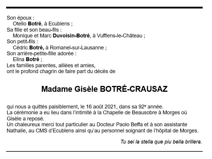 Madame Gisèle BOTRÉ-CRAUSAZ 12 juin. 1930 - 16 aoû. 2021 Avis mortuaire PFG Télecharger PDF Partager sur: Galerie PreviousNext PreviousNext
