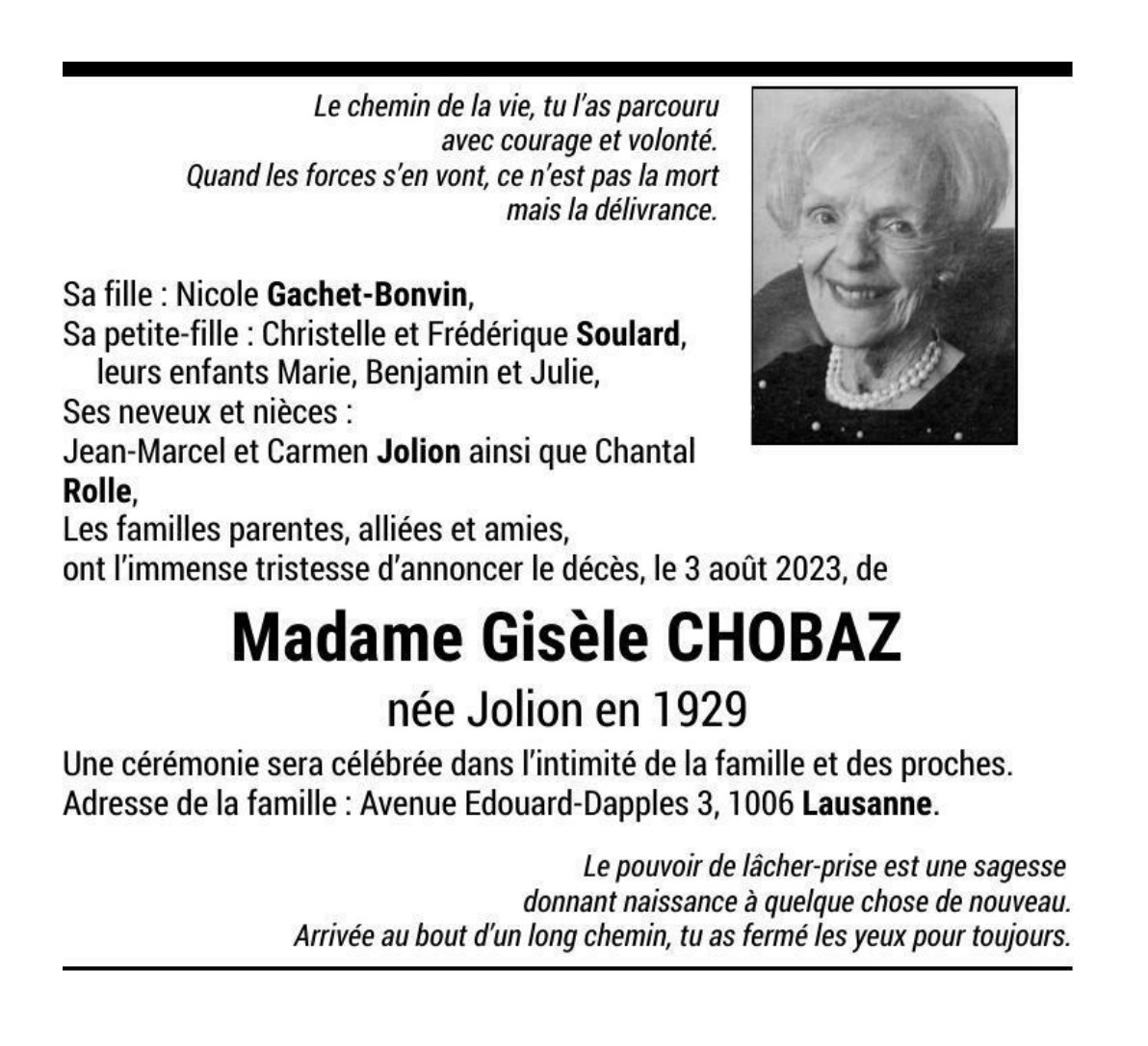 Madame Gisèle CHOBAZ 30 jan. 1929 - 03 aoû. 2023 Avis mortuaire PFG Télecharger PDF Partager sur: Galerie PreviousNext PreviousNext