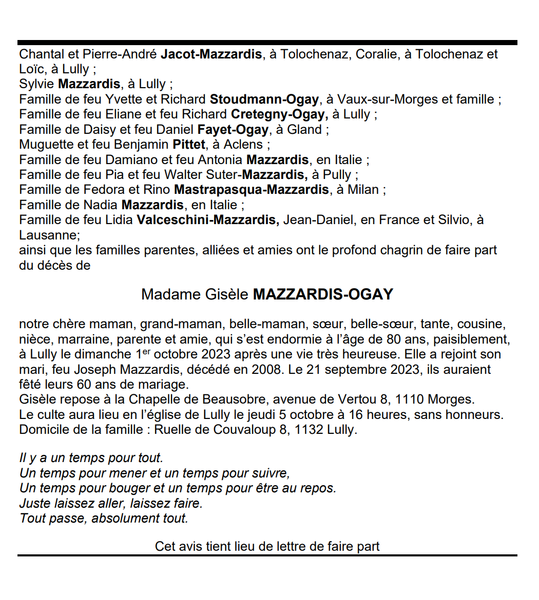 Madame Gisèle MAZZARDIS-OGAY 15 fév. 1943 - 02 oct. 2023 Avis mortuaire PFG Télecharger PDF Partager sur: Galerie PreviousNext PreviousNext