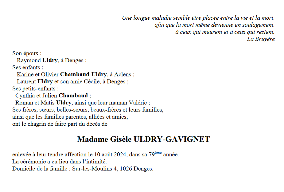 Madame Gisèle ULDRY 10 déc. 1945 - 10 aoû. 2024 Avis mortuaire PFG Télecharger PDF Partager sur: Galerie