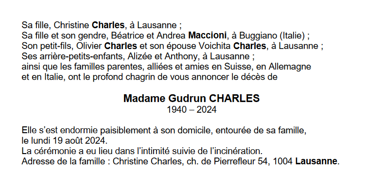 Madame Gudrun CHARLES 13 avr. 1940 - 19 aoû. 2024 Avis mortuaire PFG Télecharger PDF Partager sur: Galerie