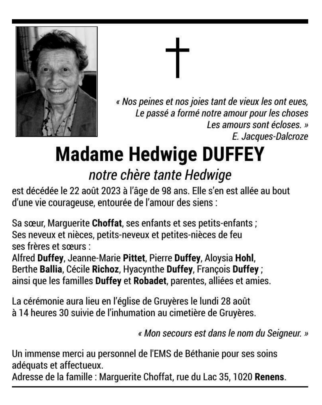 Madame Hedwige DUFFEY 11 juil. 1925 - 22 aoû. 2023 Avis mortuaire PFG Télecharger PDF Partager sur: Galerie PreviousNext PreviousNext