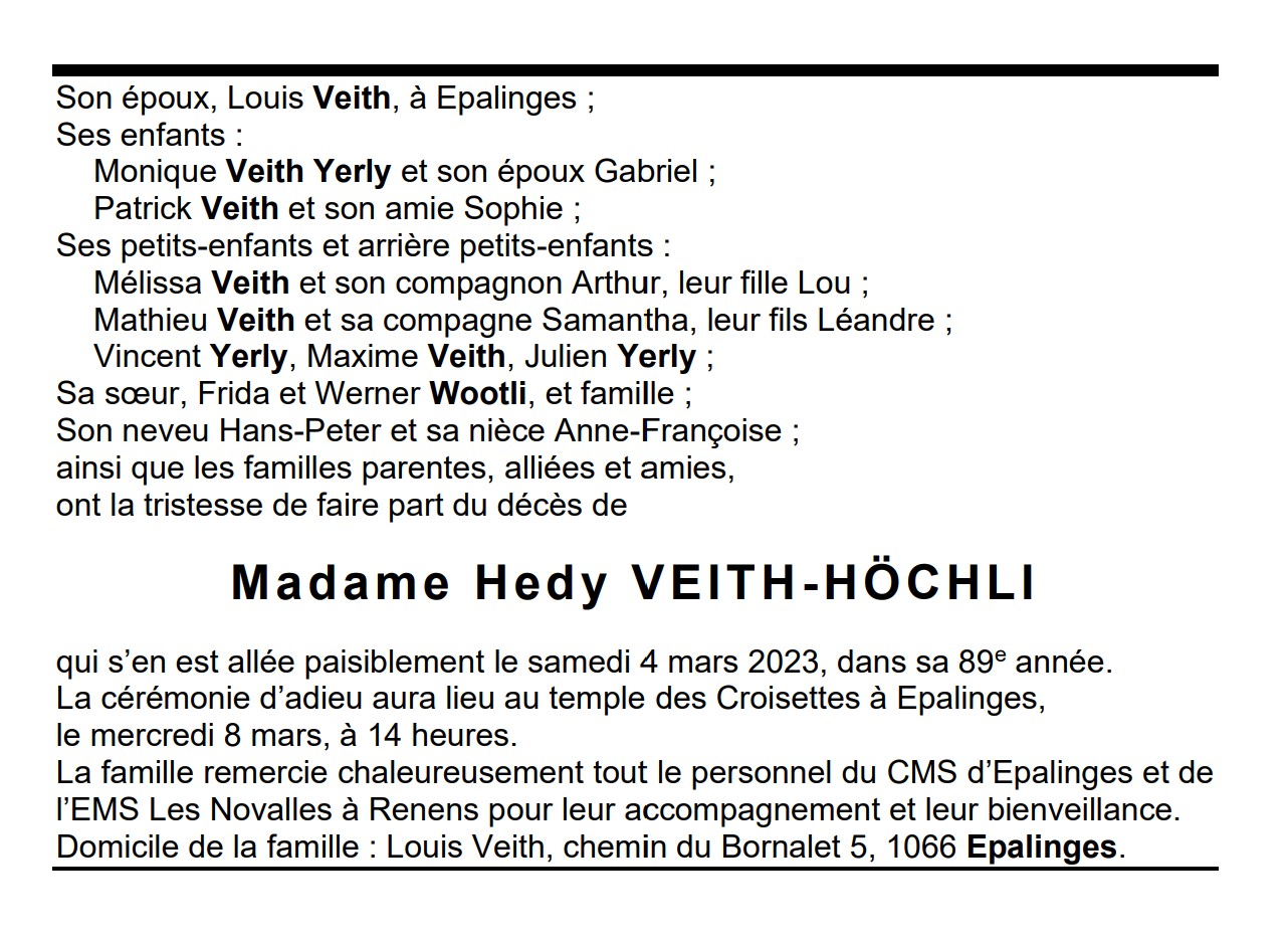 Madame Hedy VEITH-HÖCHLI 18 aoû. 1934 - 04 mar. 2023 Avis mortuaire PFG Télecharger PDF Partager sur: Galerie PreviousNext PreviousNext