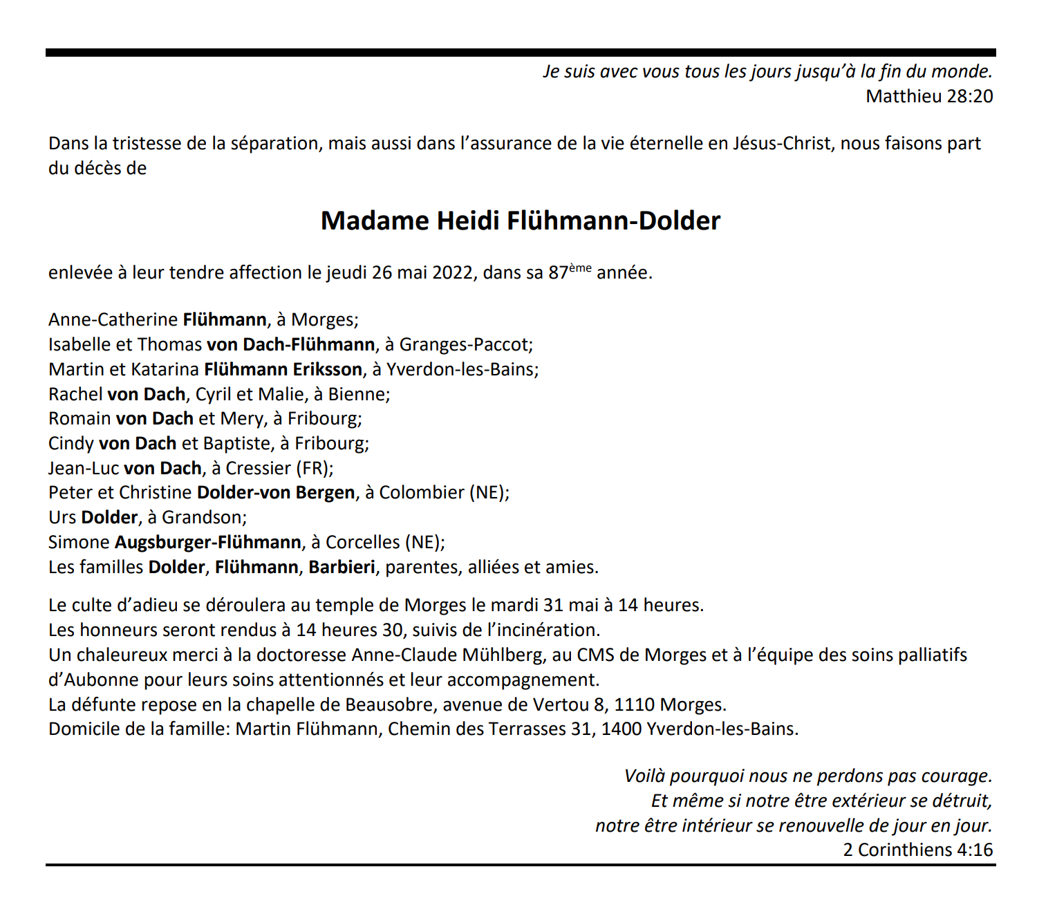 Madame Heidi Flühmann-Dolder 26 mai. 1940 - 26 mai. 2022 Avis mortuaire PFG Télecharger PDF Partager sur: Galerie PreviousNext PreviousNext