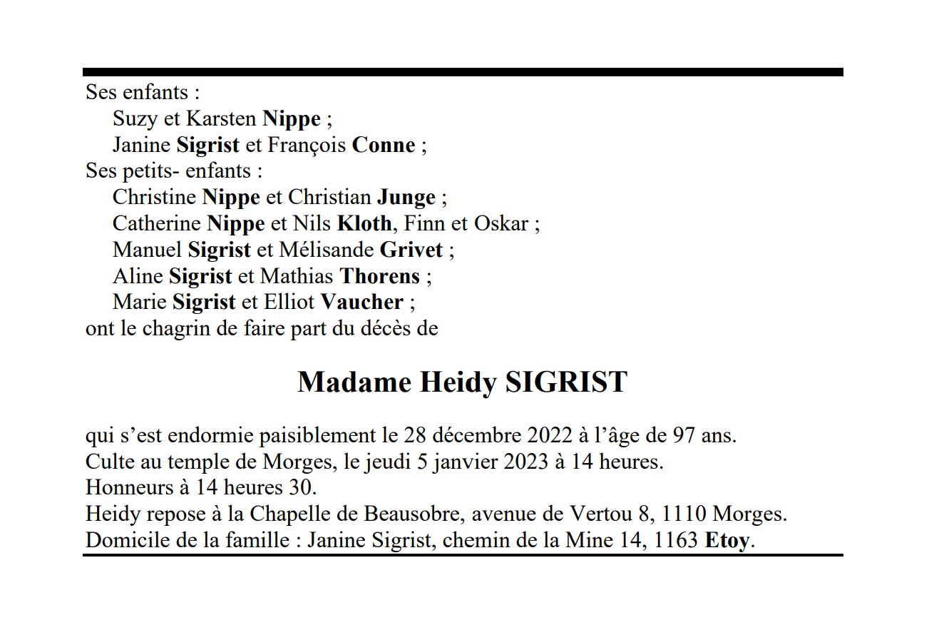 Madame Heidy SIGRIST 15 juil. 1925 - 28 déc. 2022 Avis mortuaire PFG Télecharger PDF Partager sur: Galerie PreviousNext PreviousNext