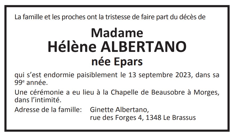 Madame Hélène ALBERTANO née Epars 13 sep. 2023 Avis mortuaire PFG Télecharger PDF Partager sur: Galerie PreviousNext PreviousNext