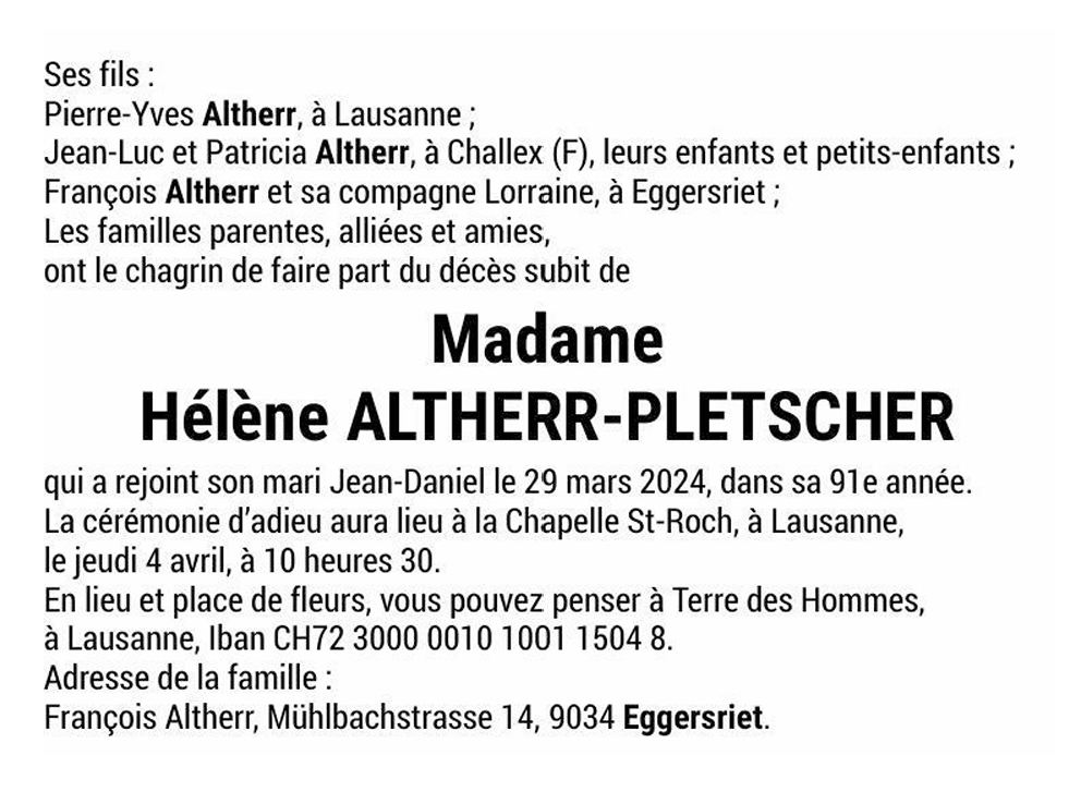 Madame Hélène ALTHERR-PLETSCHER 29 nov. 1933 - 29 mar. 2024 Avis mortuaire PFG Télecharger PDF Partager sur: Galerie PreviousNext PreviousNext