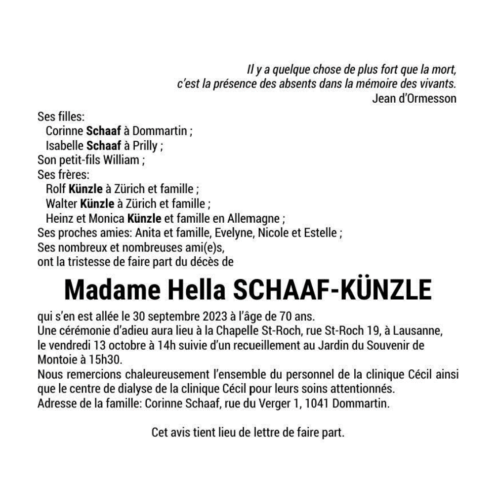 Madame Hella SCHAAF-KÜNZLE 09 avr. 1953 - 30 sep. 2023 Avis mortuaire PFG Télecharger PDF Partager sur: Galerie PreviousNext PreviousNext