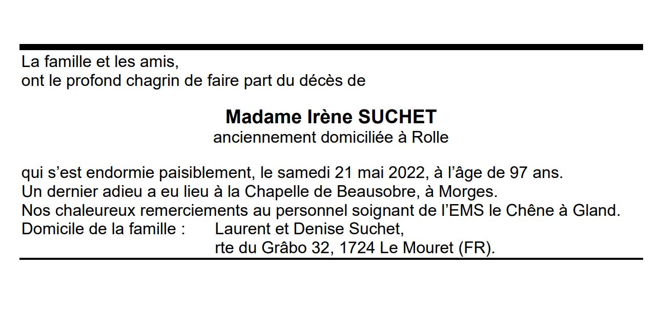Madame Irène SUCHET 13 mai. 1925 - 21 mai. 2022 Avis mortuaire PFG Télecharger PDF Partager sur: Galerie PreviousNext PreviousNext
