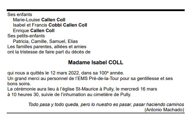 Madame Isabel COLL 11 juil. 1922 - 12 mar. 2022 Avis mortuaire PFG Télecharger PDF Partager sur: Galerie PreviousNext PreviousNext