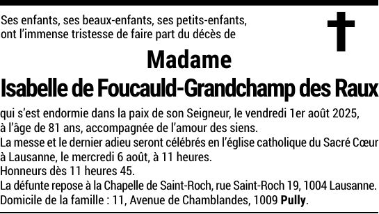 Madame Isabelle de Foucauld-Grandchamp des Raux 08 juil. 1944 - 01 aoû. 2025 Avis mortuaire PFG Partager sur: Galerie PreviousNext PreviousNext