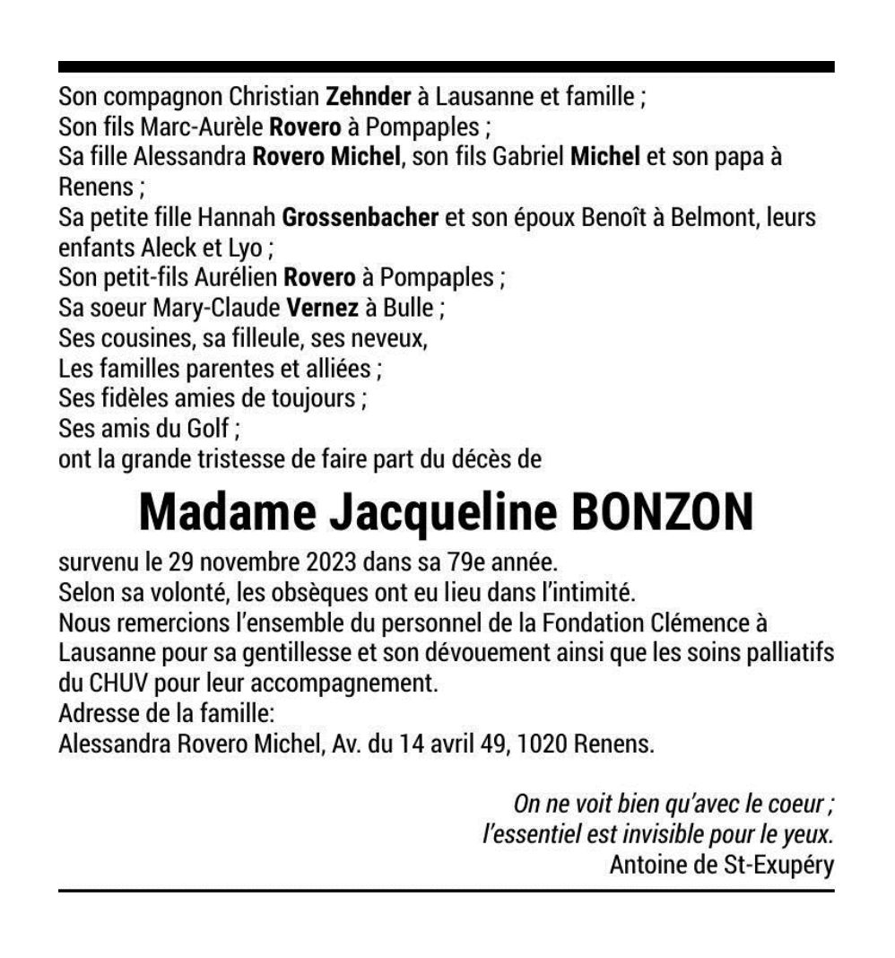 Madame Jacqueline BONZON 02 déc. 1944 - 29 nov. 2023 Avis mortuaire PFG Télecharger PDF Partager sur: Galerie PreviousNext PreviousNext