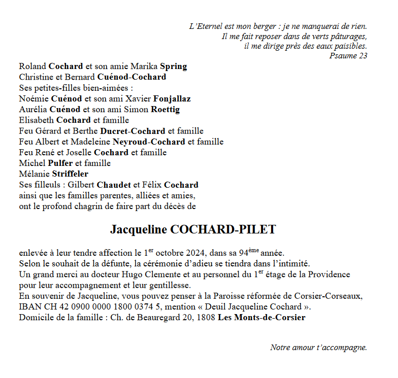 Madame Jacqueline COCHARD-PILET 03 sep. 1931 - 01 oct. 2024 Avis mortuaire PFG Télecharger PDF Partager sur: Galerie PreviousNext PreviousNext