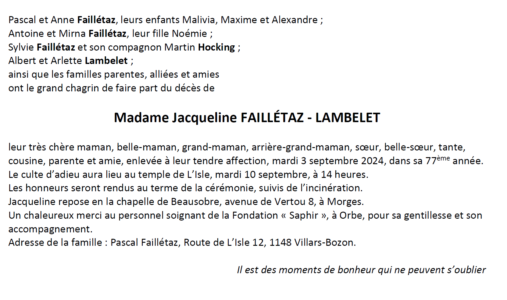 Madame Jacqueline FAILLÉTAZ - LAMBELET 02 aoû. 1948 - 03 sep. 2024 Avis mortuaire PFG Télecharger PDF Partager sur: Galerie PreviousNext PreviousNext