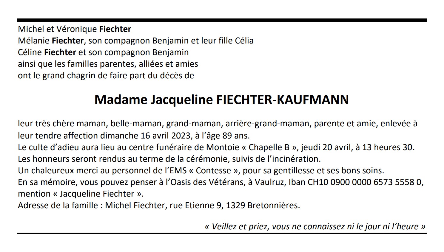 Madame Jacqueline FIECHTER-KAUFMANN 12 fév. 1934 - 16 avr. 2023 Avis mortuaire PFG Télecharger PDF Partager sur: Galerie PreviousNext PreviousNext