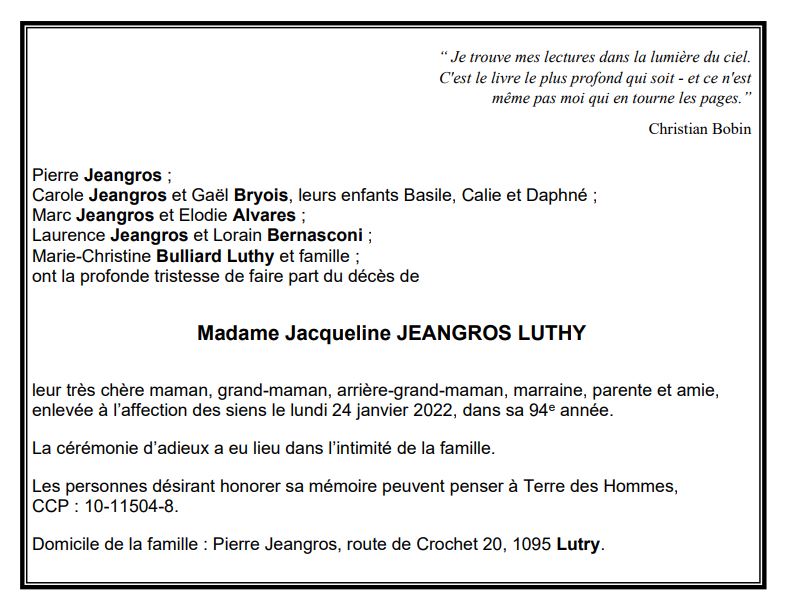 Madame Jacqueline JEANGROS LUTHY 17 aoû. 1928 - 24 jan. 2022 Avis mortuaire PFG Télecharger PDF Partager sur: Galerie PreviousNext PreviousNext