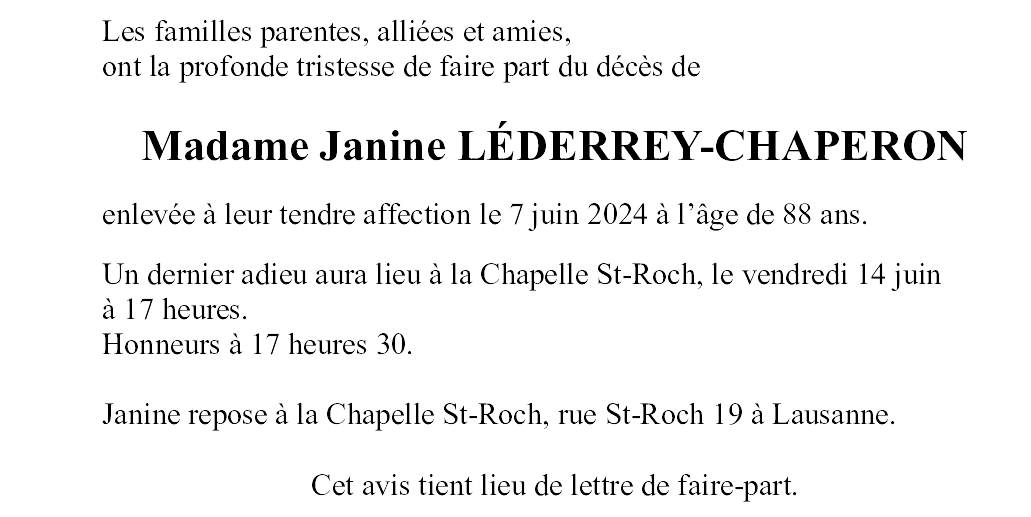 Madame Janine LÉDERREY 21 aoû. 1935 - 07 juin. 2024 Avis mortuaire PFG Partager sur: Galerie PreviousNext PreviousNext