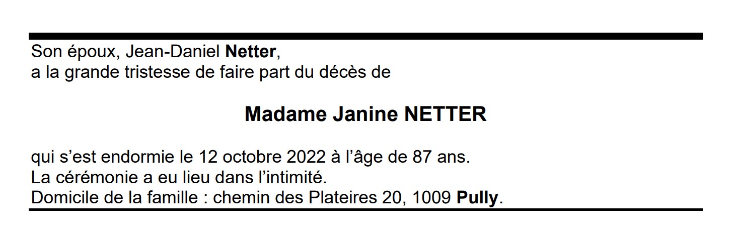 Madame Janine NETTER 14 aoû. 1935 - 12 oct. 2022 Avis mortuaire PFG Télecharger PDF Partager sur: Galerie PreviousNext PreviousNext