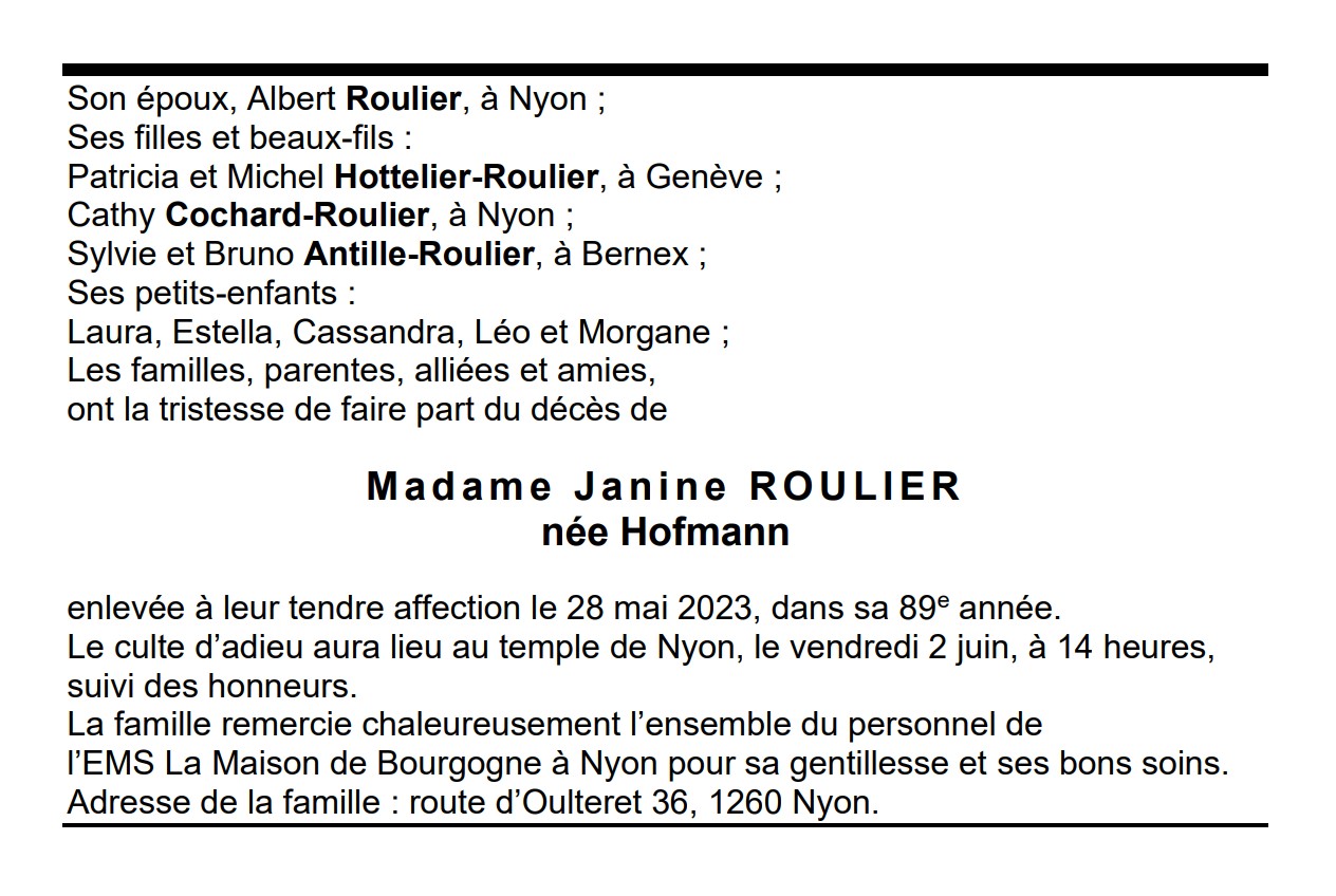 Madame Janine ROULIER née Hofmann 18 nov. 1934 - 28 mai. 2023 Avis mortuaire PFG Télecharger PDF Partager sur: Galerie PreviousNext PreviousNext