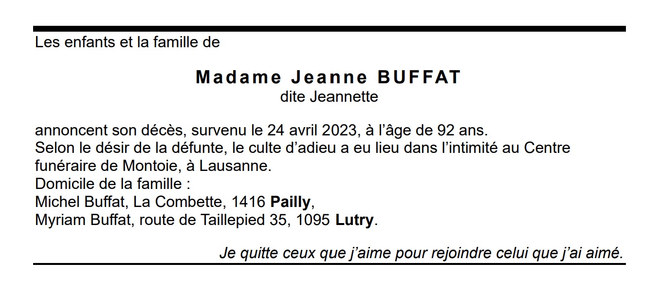Madame Jeanne BUFFAT dite Jeannette 06 jan. 1931 - 24 avr. 2023 Avis mortuaire PFG Télecharger PDF Partager sur: Galerie PreviousNext PreviousNext