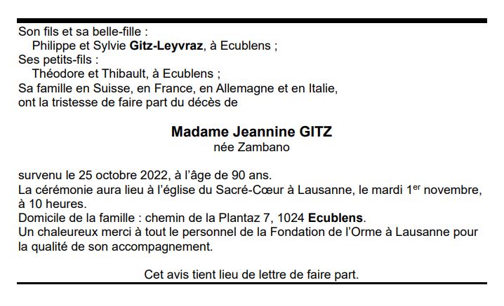 Madame Jeannine GITZ née Zambano 03 jan. 1932 - 25 oct. 2022 Avis mortuaire PFG Télecharger PDF Partager sur: Galerie PreviousNext PreviousNext