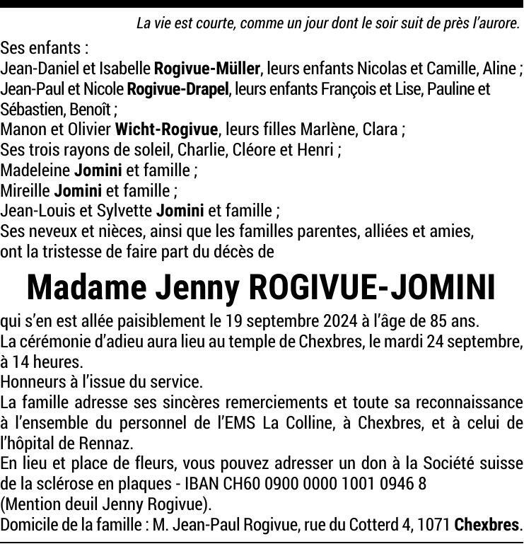 Madame Jenny ROGIVUE-JOMINI 12 mai. 1939 - 19 sep. 2024 Avis mortuaire PFG Partager sur: Galerie PreviousNext PreviousNext