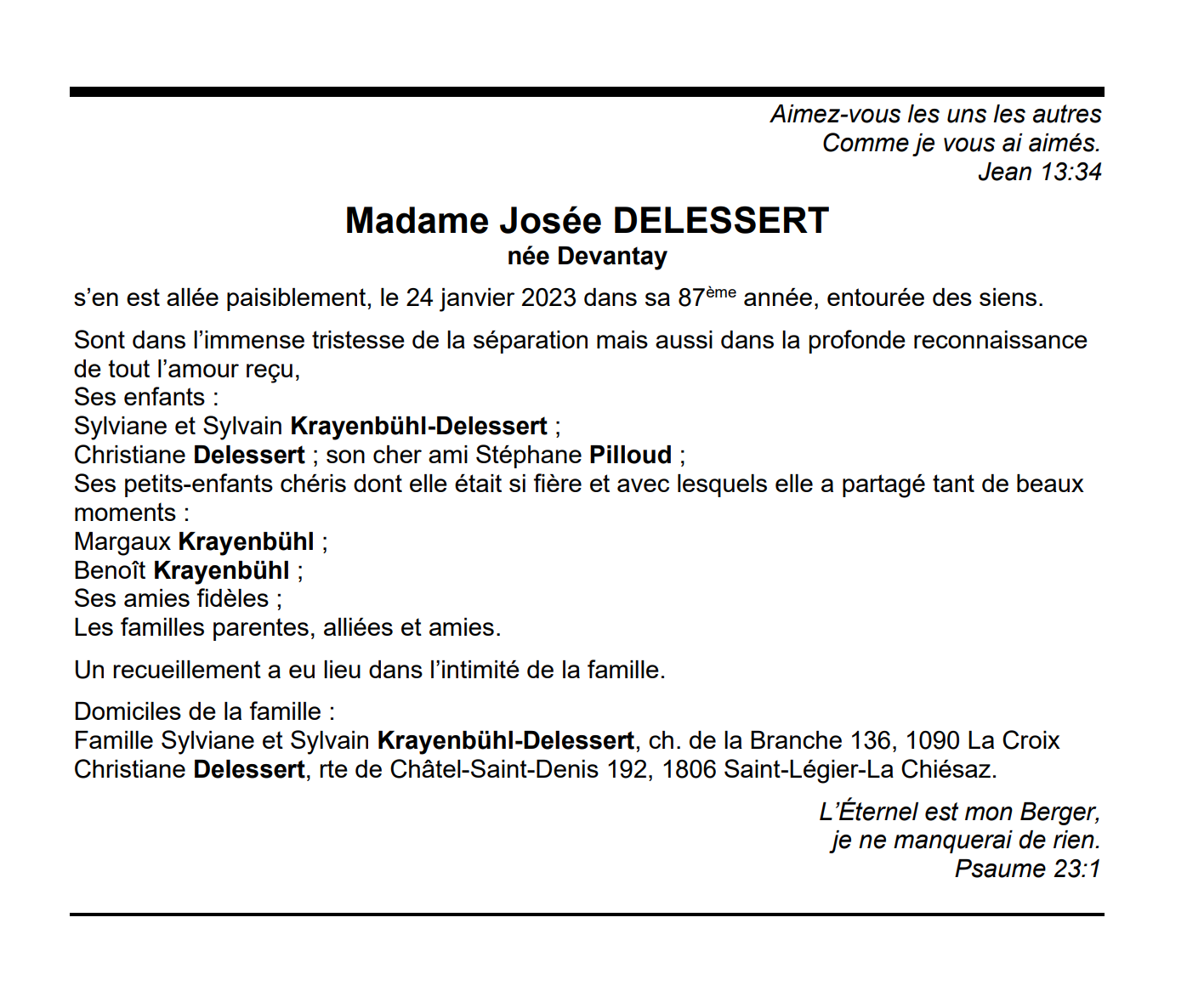 Madame Josée DELESSERT 22 aoû. 1936 - 24 jan. 2023 Avis mortuaire PFG Télecharger PDF Partager sur: Galerie PreviousNext PreviousNext