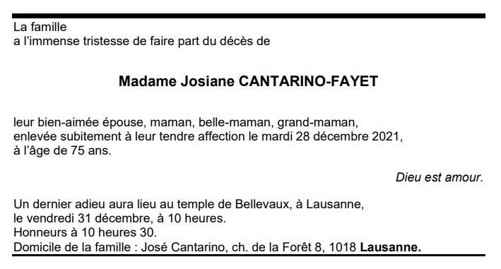 Madame Josiane CANTARINO-FAYET 02 déc. 1946 - 28 déc. 2021 Avis mortuaire PFG Télecharger PDF Partager sur: Galerie PreviousNext PreviousNext