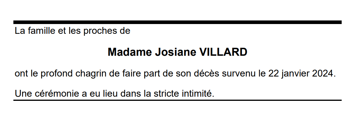 Madame Josiane VILLARD 01 fév. 1948 - 22 jan. 2024 Avis mortuaire PFG Télecharger PDF Partager sur: Galerie PreviousNext PreviousNext