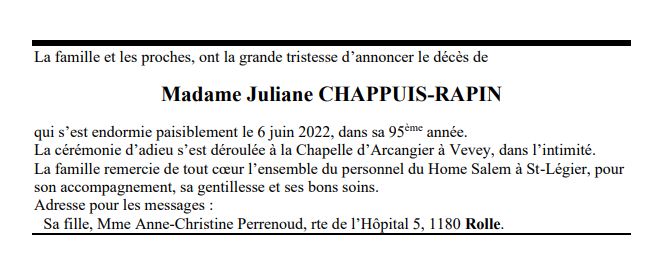 Madame Juliane CHAPPUIS-RAPIN 26 juil. 1927 - 06 juin. 2022 Avis mortuaire PFG Télecharger PDF Partager sur: Galerie PreviousNext PreviousNext