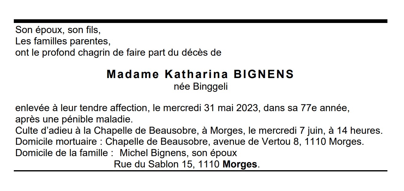 Madame Katharina BIGNENS née Binggeli 18 oct. 1946 - 31 mai. 2023 Avis mortuaire PFG Télecharger PDF Partager sur: Galerie PreviousNext PreviousNext