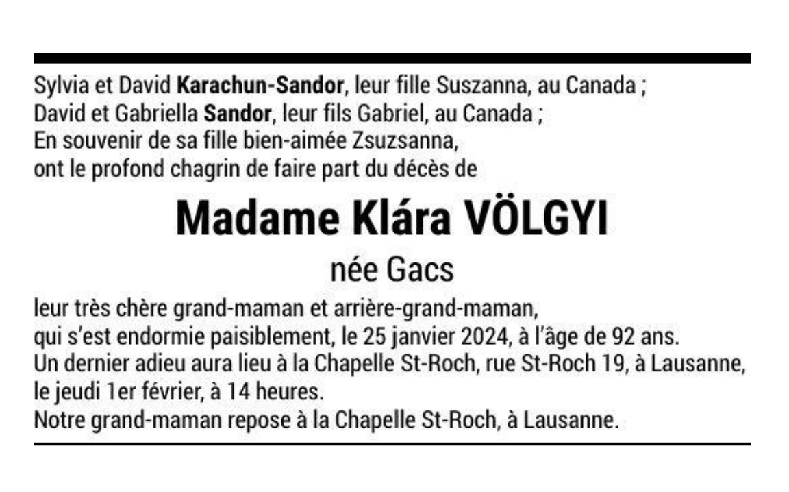 Madame Klára VÖLGYI née Gacs 19 juin. 1931 - 25 jan. 2024 Avis mortuaire PFG Télecharger PDF Partager sur: Galerie PreviousNext PreviousNext