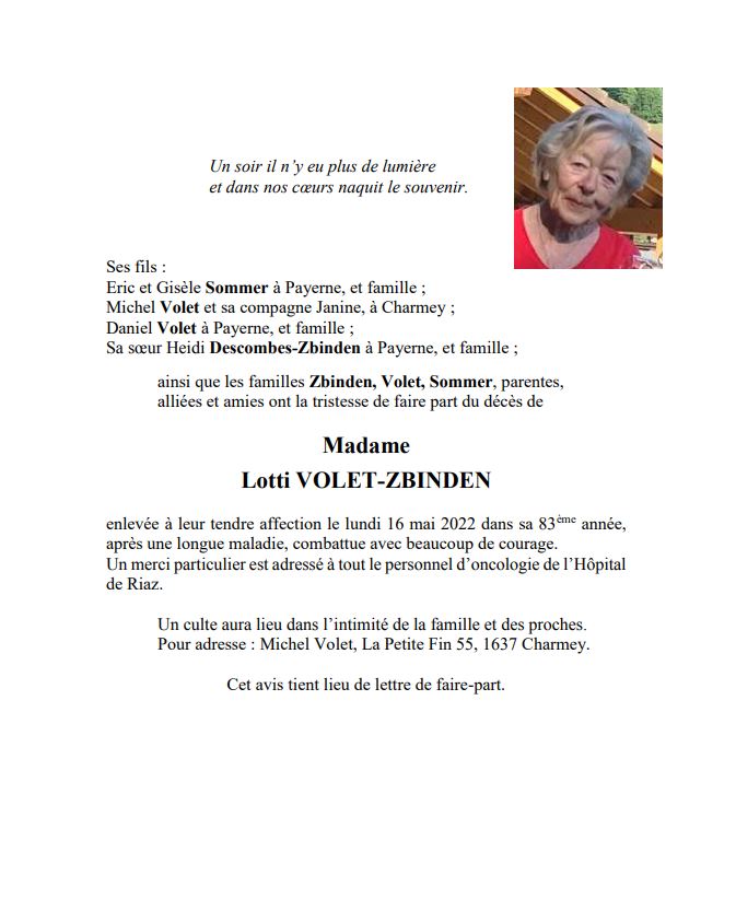 Madame Lotti VOLET-ZBINDEN 10 juil. 1939 - 16 mai. 2022 Avis mortuaire PFG Télecharger PDF Partager sur: Galerie PreviousNext PreviousNext