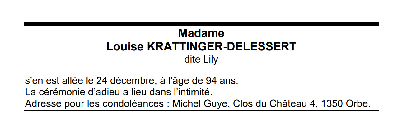 Madame Louise KRATTINGER-DELESSERT 27 jan. 1928 - 24 déc. 2022 Avis mortuaire PFG Télecharger PDF Partager sur: Galerie PreviousNext PreviousNext