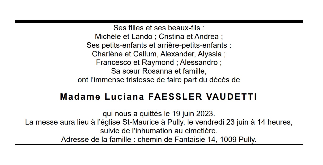 Madame Luciana FAESSLER VAUDETTI 15 déc. 1930 - 19 juin. 2023 Avis mortuaire PFG Télecharger PDF Partager sur: Galerie PreviousNext PreviousNext