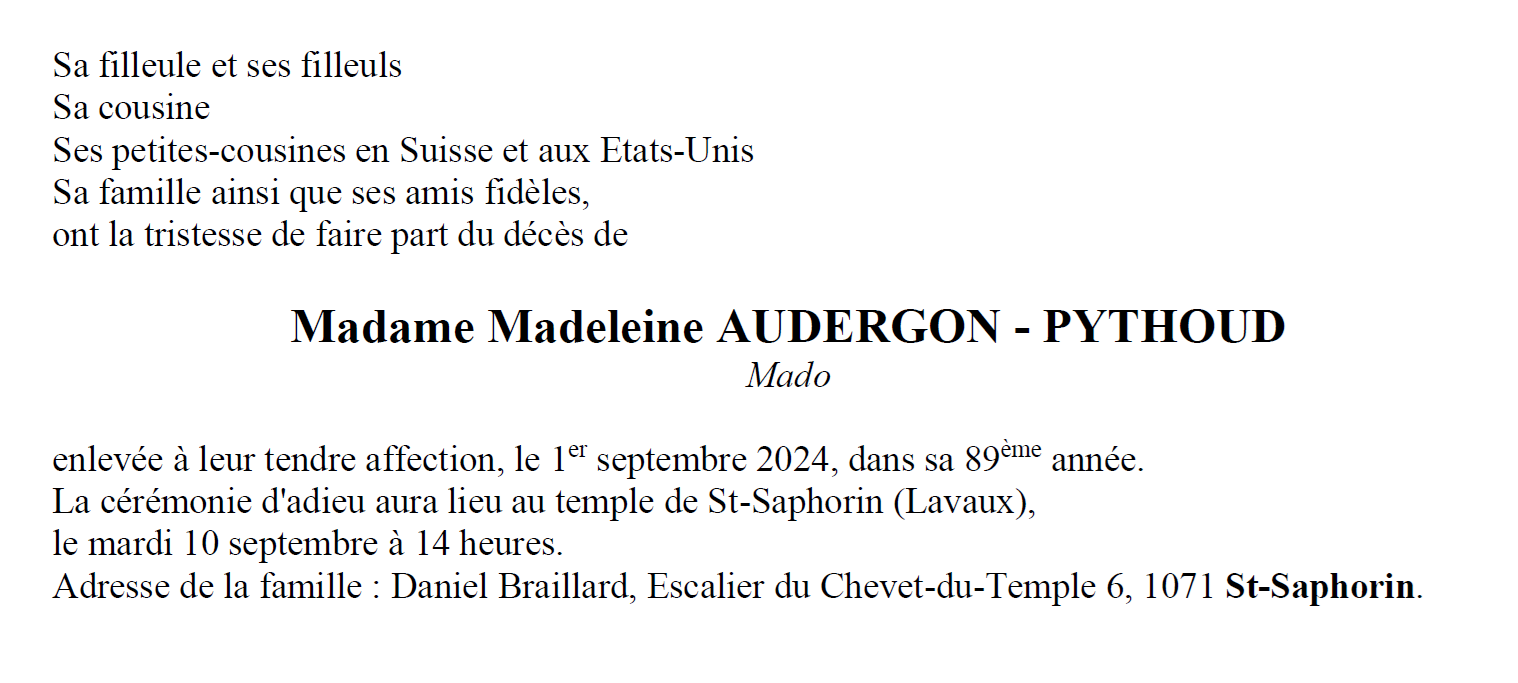 Madame Madeleine AUDERGON-PYTHOUD 04 mar. 1935 - 01 sep. 2024 Avis mortuaire PFG Télecharger PDF Partager sur: Galerie