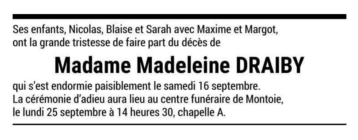 Madame Madeleine DRAIBY 05 avr. 1927 - 16 sep. 2023 Avis mortuaire PFG Télecharger PDF Partager sur: Galerie PreviousNext PreviousNext