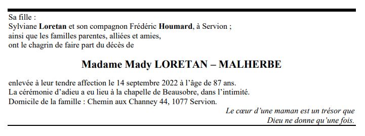 Madame Mady LORETAN – MALHERBE 28 mai. 1935 - 14 sep. 2022 Avis mortuaire PFG Télecharger PDF Partager sur: Galerie PreviousNext PreviousNext