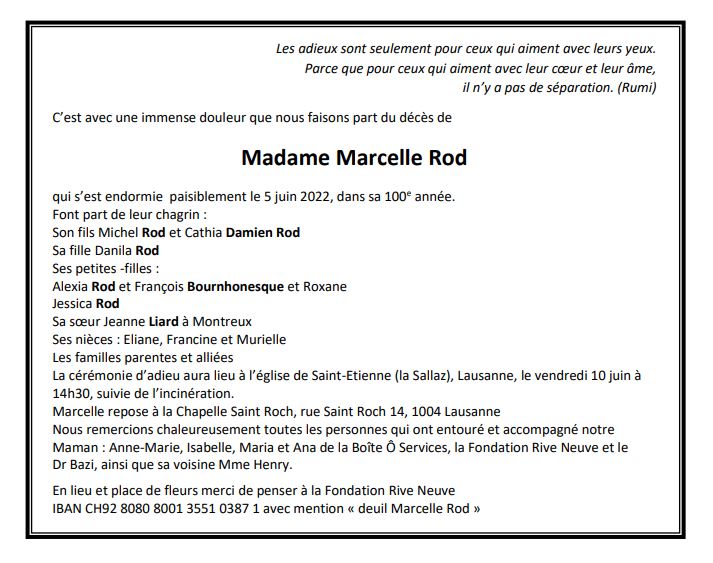 Madame Marcelle Rod 08 avr. 1923 - 05 juin. 2022 Avis mortuaire PFG Télecharger PDF Partager sur: Galerie PreviousNext PreviousNext