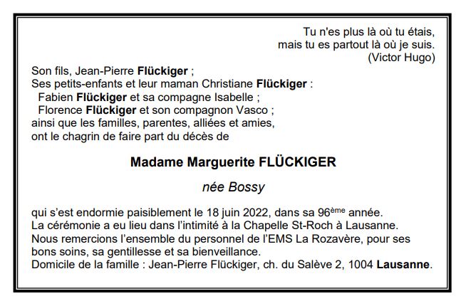 Madame Marguerite FLÜCKIGER 15 mai. 1927 - 18 juin. 2022 Avis mortuaire PFG Télecharger PDF Partager sur: Galerie PreviousNext PreviousNext