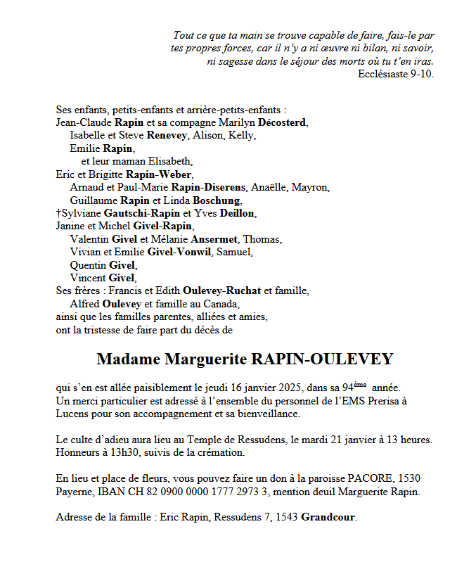 Madame Marguerite RAPIN-OULEVEY 21 sep. 1931 - 16 jan. 2025 Avis mortuaire PFG Télecharger PDF Partager sur: Galerie PreviousNext PreviousNext