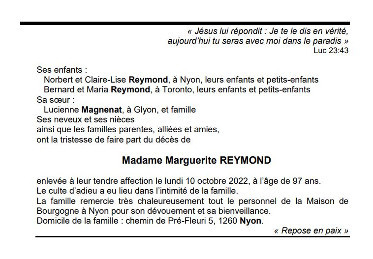 Madame Marguerite REYMOND 27 sep. 1925 - 10 oct. 2022 Avis mortuaire PFG Télecharger PDF Partager sur: Galerie PreviousNext PreviousNext