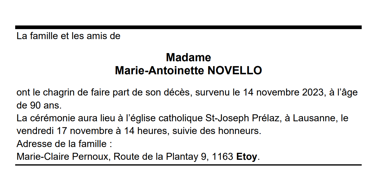 Madame Marie-Antoinette NOVELLO 30 mar. 1933 - 14 nov. 2023 Avis mortuaire PFG Télecharger PDF Partager sur: Galerie PreviousNext PreviousNext