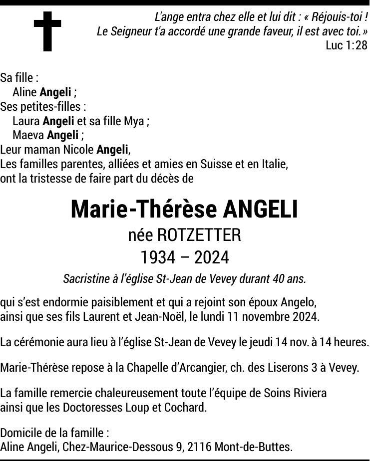Madame Marie-Thérèse ANGELI 24 juin. 1934 - 11 nov. 2024 Avis mortuaire PFG Partager sur: Galerie PreviousNext PreviousNext